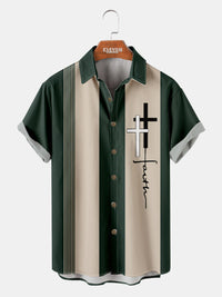 Subtle and structured, this vertical-striped shirt features a bold triple-cross design with the word “faith” woven into the artwork. A balanced piece for those who want to carry their values with them—ideal for community events, church functions, or quiet moments of reflection.