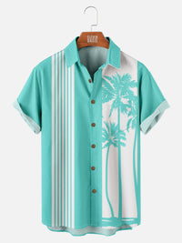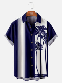 Transport yourself to tropical evenings with our sleek palm tree shirt featuring elegant silhouettes against bold vertical stripes. This sophisticated design combines classic bowling shirt structure with vacation-ready imagery, creating a versatile resort style that transitions seamlessly from beachside casual to evening venues.