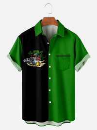 Vibrant green and black color-block shirt featuring Rat Fink-inspired hot rod artwork. This bold design channels Ed "Big Daddy" Roth's iconic monster characters that defined custom car culture of the 1960s. Complete with classic racing stripes for authentic automotive styling appeal.