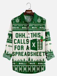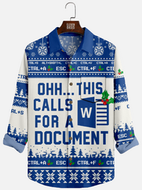 Hilarious office-themed button-up featuring "Ohh... This Calls For A PowerPoint" text with festive Fair Isle borders. Available in multiple colors and software variations including Word and Excel for office professionals. Perfect for adding workplace humor to holiday gatherings with a clever tech twist on traditional ugly sweater patterns.