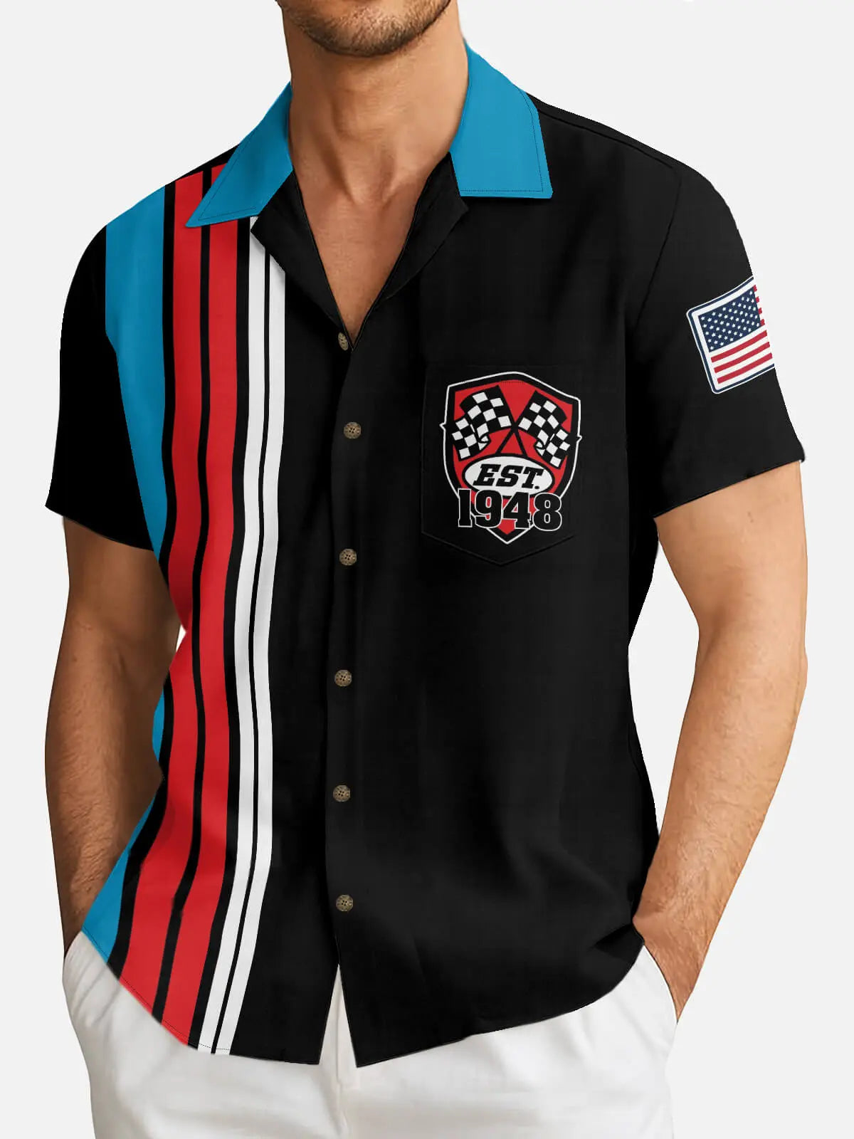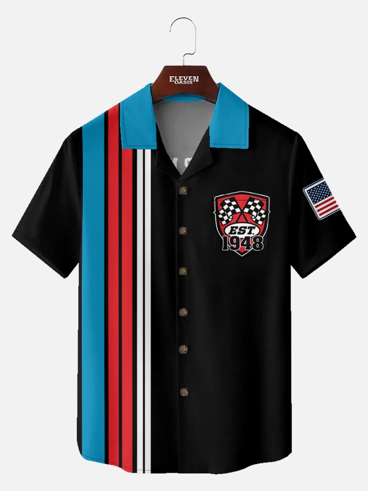 This shirt brings racing heritage to life with bold, vertical stripes in red, blue, and yellow, paired with a vintage-style logo and "EST. 1948" patch. Perfect for NASCAR enthusiasts, it's easy to customize with your name, desired colors, or favorite driver's number for a personalized, track-ready look.