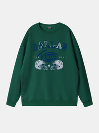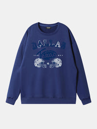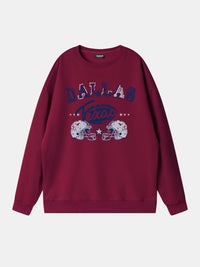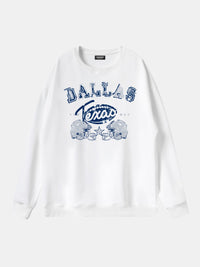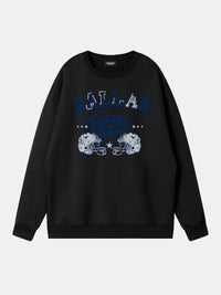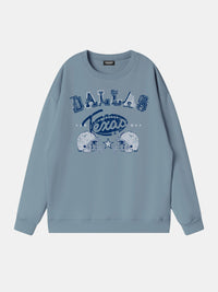 Sporty sweatshirt featuring a distressed collegiate-style "Dallas Texas” graphic with football helmets and star detailing. The vintage-inspired print celebrates city pride and football culture, making it a versatile piece for fans who want to bring game-day energy into their casual wardrobe.