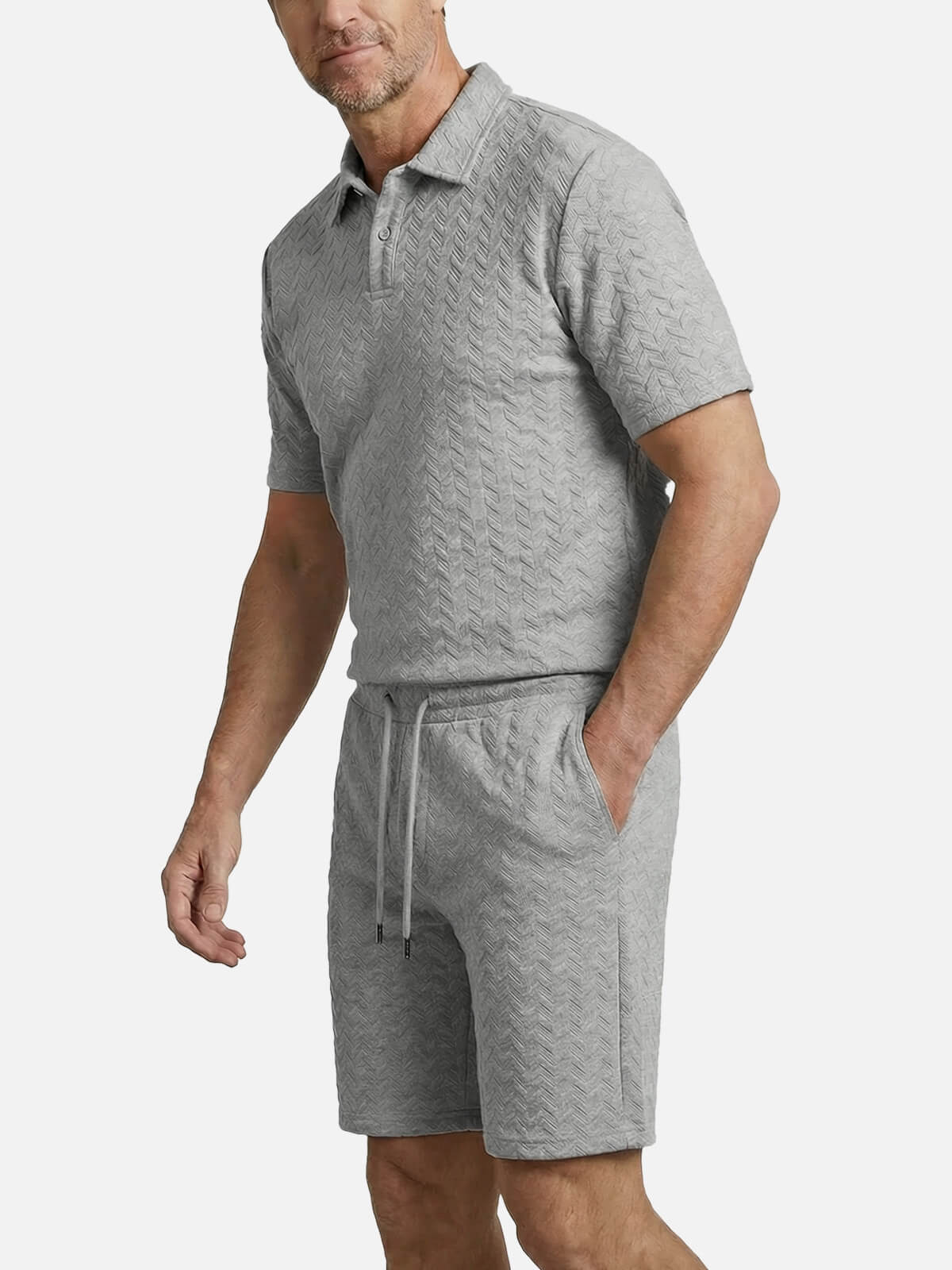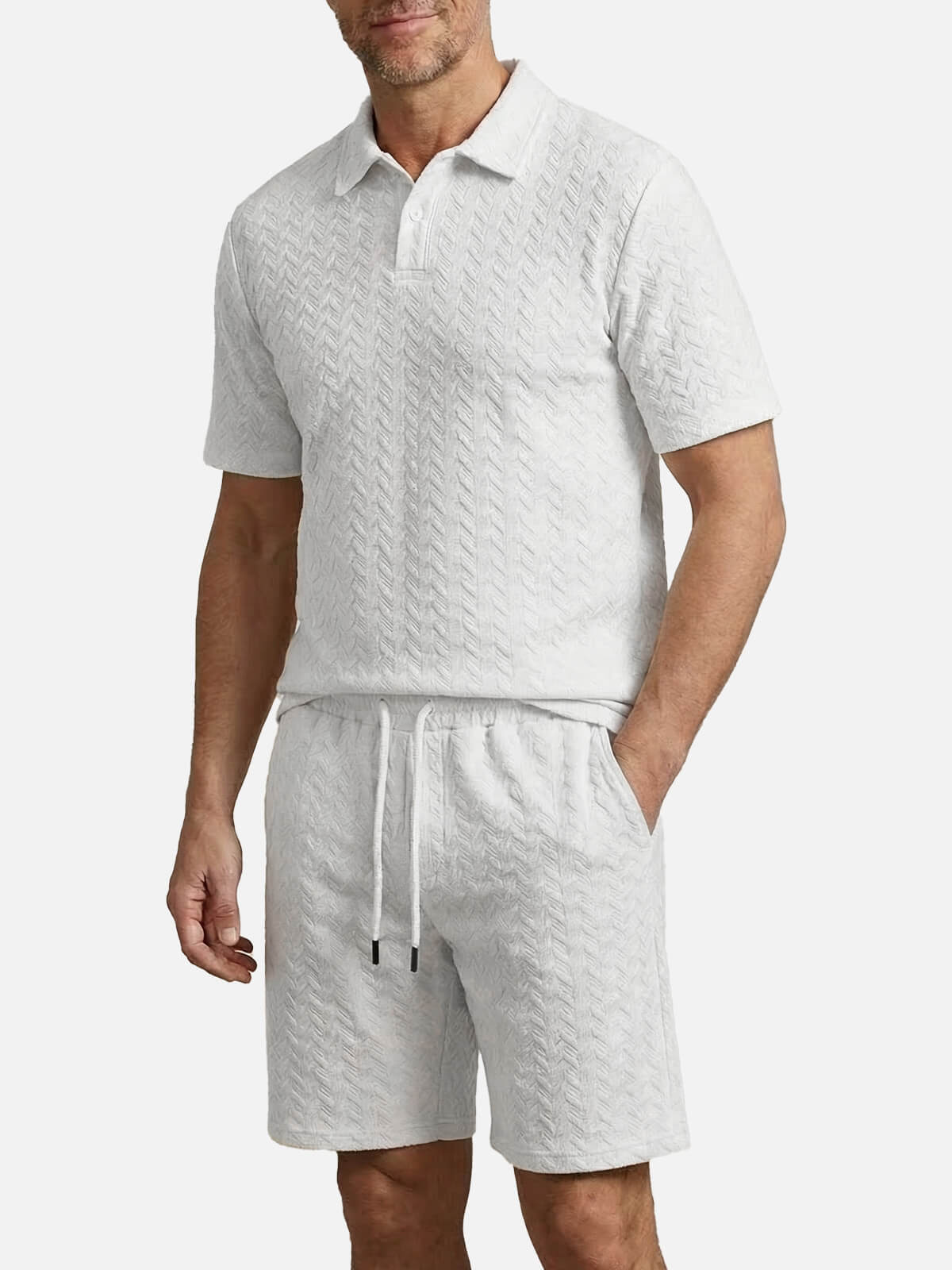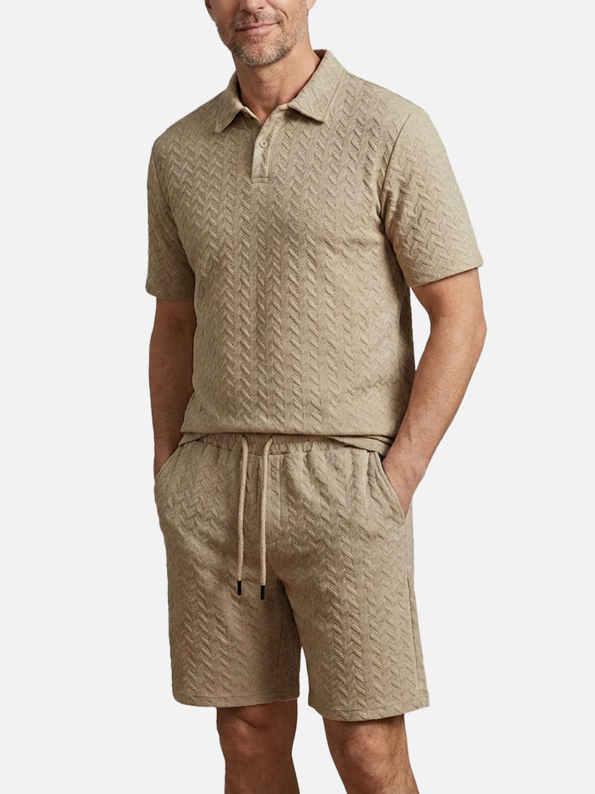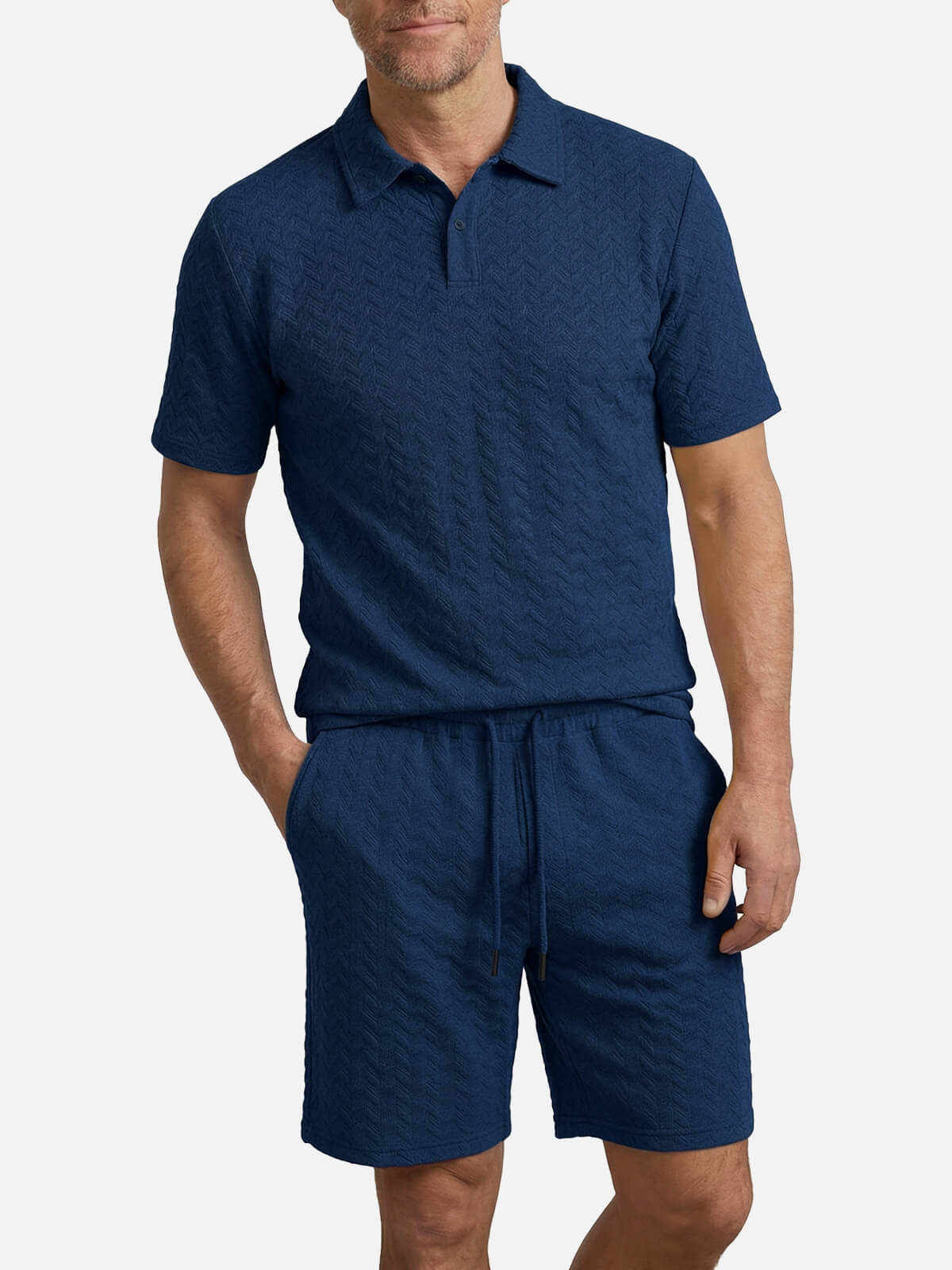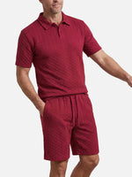 This slim-fit set offers a stylish and comfortable look, combining a textured polo with matching shorts. Made from breathable 100% polyester, it's perfect for casual outings, weekend getaways, or relaxing at home. Customize the polo with your name for a personalized touch.