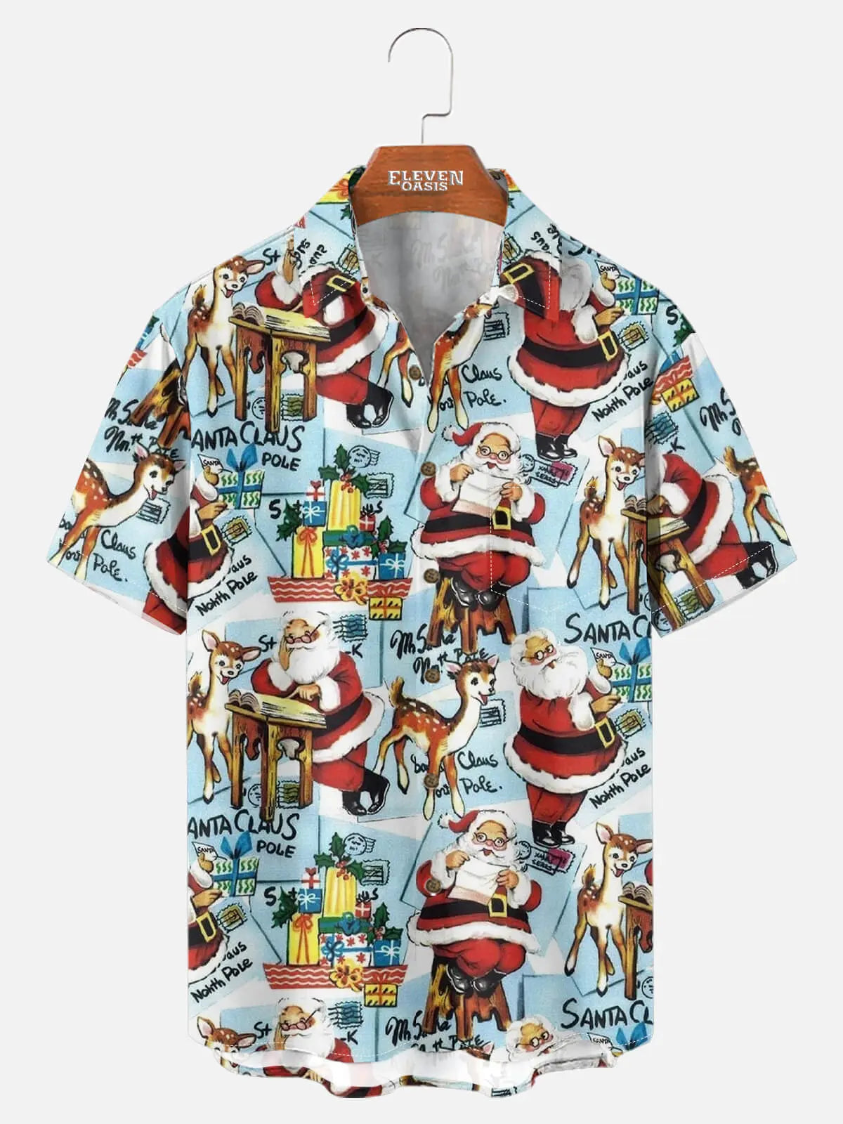 A playful retro Christmas shirt covered in mid-century Santa and reindeer illustrations. Designed with a classic spread collar and an easy, festive look—perfect for holiday parties, family photos, and relaxed December outings.