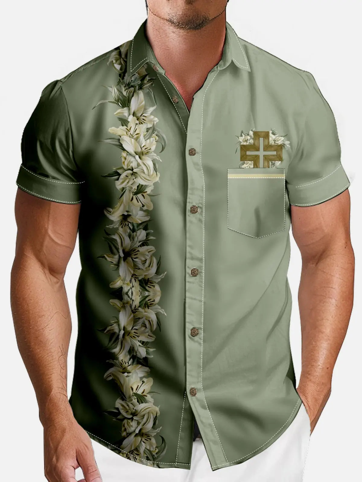 Elegant Easter design featuring cascading Easter lilies in vertical arrangement alongside golden cross with pocket detail and refined stitching accents. This sophisticated shirt combines resurrection symbolism with spring floral beauty, creating refined apparel for believers who appreciate understated faith-based fashion with classic Easter lily imagery and tasteful religious elements.